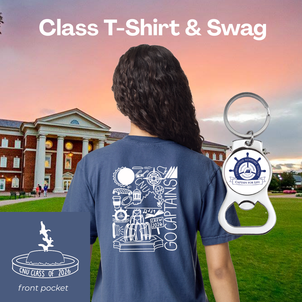 Pickup will be available at Alumni Launch, BINGO, Grad Fest - Dinner and Dessert, and Captain's Coffee and Doughnuts. The last opportunity to pickup your t-shirt and merch bundle will be on Commencement on May, 16, 2026.